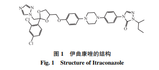 伊曲康唑(圖 1),分子式為 C35H38Cl2N8O4,是臨 床應(yīng)用廣泛的抗真菌藥物,屬于三唑類抗真菌藥物家 族的關(guān)鍵成員.它存在于世界衛(wèi)生組織的基本藥物 清單上,是基本衛(wèi)生系統(tǒng)中最重要的藥物之一,其安 全性毋庸置疑.目前可用的口服抗真菌劑伊曲康唑 是一種有效的 Hedgehog 途徑拮抗劑,通過抑制羊毛固醇 14α 去甲基化酶(麥角固醇合成的關(guān)鍵酶)破 壞真菌細(xì)胞膜結(jié)構(gòu)完整性,從而使真菌生長受到有效抑制。